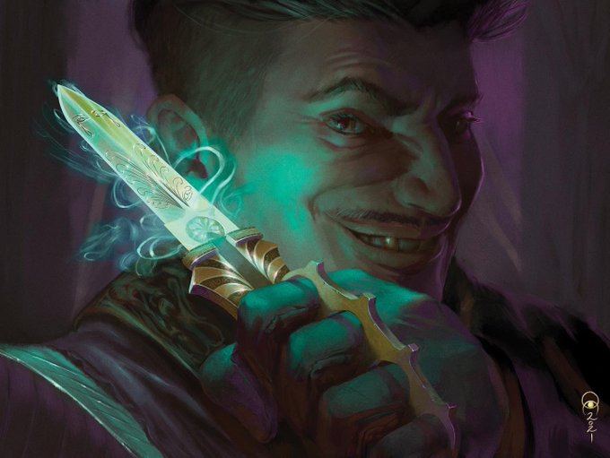 “Quick-Draw Dagger”. A digital illustration made In #procreate and #adobephotoshop I used my own face as a model. I made tweaks to create a character that would look like a scoundrel. My only piece made for the #magicthegathering set Streets of New Capenna. #wotcstaff #digitalart