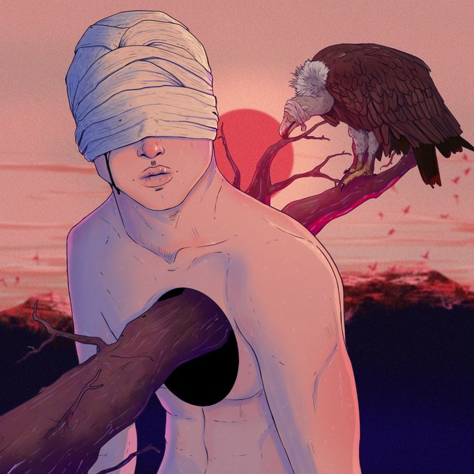 The blind vulture of death followed the sweet taste of greed, pride, lust and envy of the man untill the end of the earth, where the blind man stopped in front of his destiny, waiting to be consumed, unable to taste again the pleasure that once he called life.