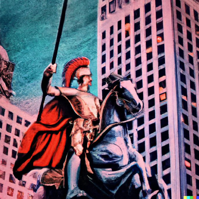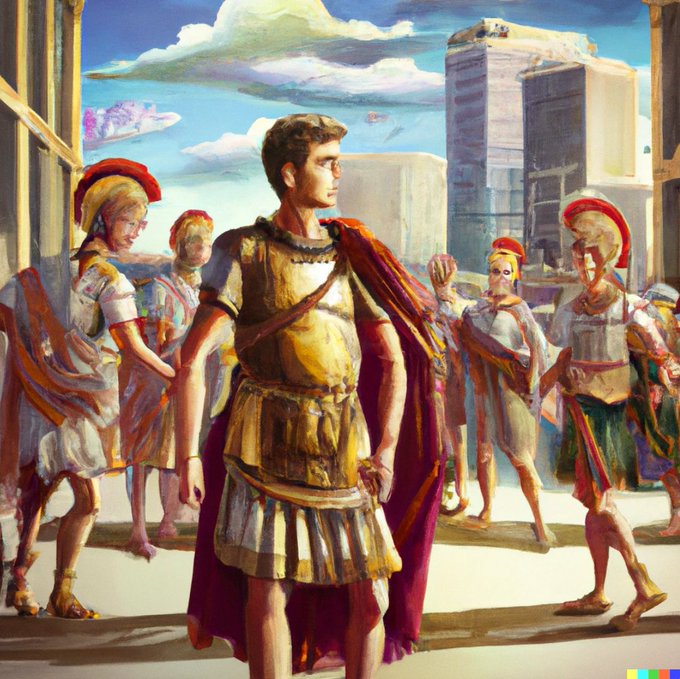 a painting of ancient Roman legionaries visiting New York City