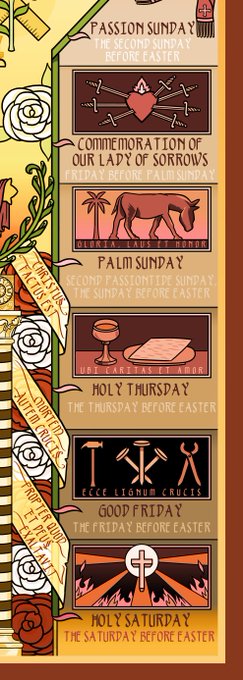 (flipped so you can see) - i also didnt use figures, it just made the whole thing look a lot less clean, so its all symbols and emblems. and then, none of them repeat. so if two saints have lilies as their attributes, theyre different images.