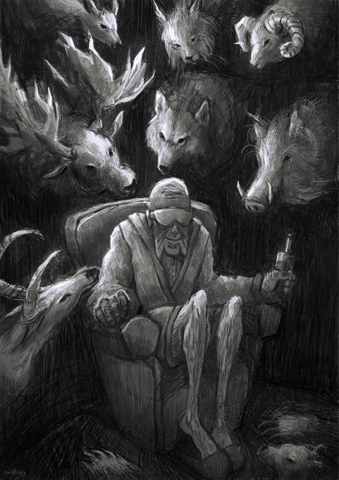 my piece for the “i see you” zine!! my interpretation was abt the hunted’s resentment towards the hunter, so i drew animal head trophies, all from different colonized countries, coming alive at night and staring at a sleeping retired european hunter