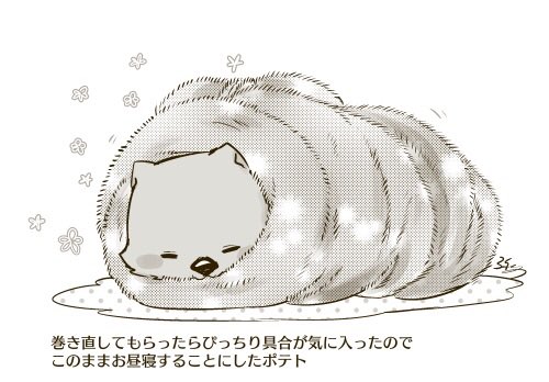 巻き直してもらったらぴっちり具合が気に入ったのでお昼寝することにしたポテト。 ぴっちりぬくぬく。