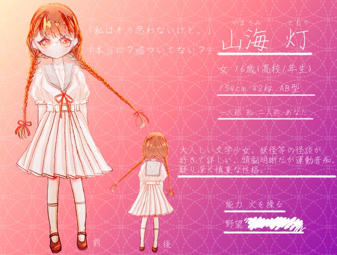 山海灯(@Akuri_ura) 「私、山海灯。隣にいるのは爍よ」 「爍じゃ、よろしく頼むのぉ」