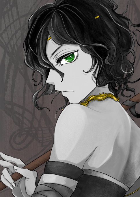 色のない肌に燃えるような緑の目