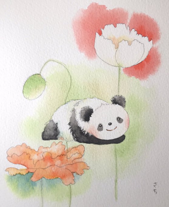 春の花と、微睡むゆいひん🐼🎀 ポピー🌼「春の花とゆいひん①」 もっと茎を太くしてもよかったな。 #結浜 #yuihin #giantpanda #panda #大熊猫 #панда #パンダ #動物画 #水彩画 #イラスト #watercolor