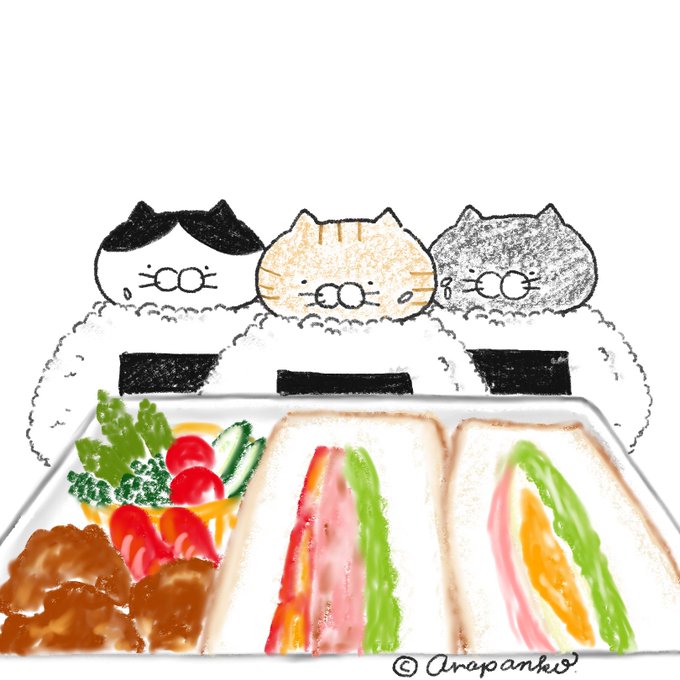 #ごはんねこ #猫 #イラスト #ゆるキャラ #猫好きさんと繋がりたい #イラスト好きな人と繋がりたい #白猫に憧れる三毛ちびズ