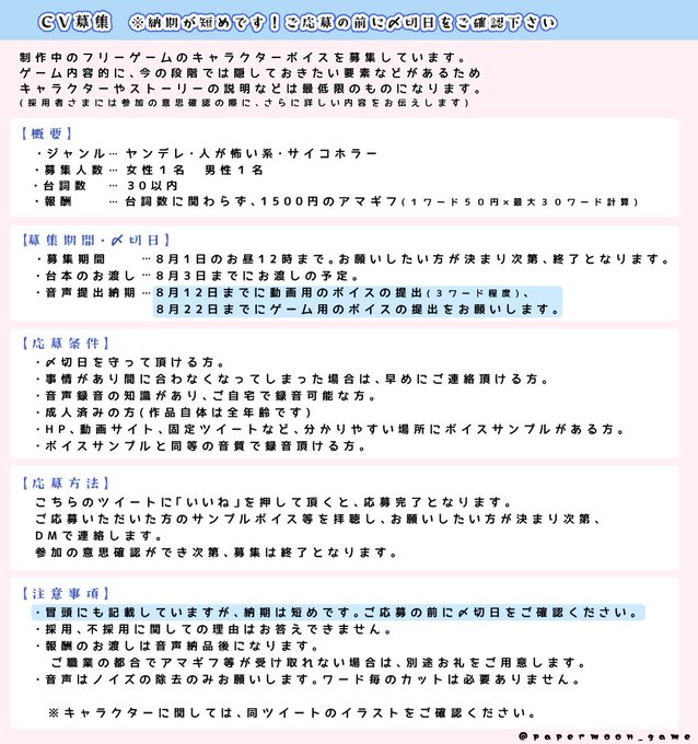 先日募集した、制作中のゲームのキャスト様が決定しました!🥳