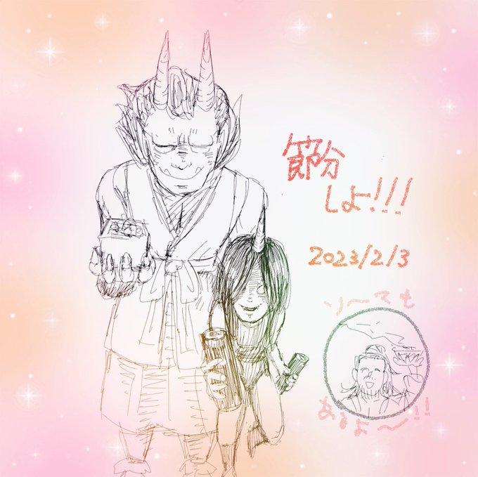 #今月描いた絵を晒そう 節分ゼンキゴキと追儺偉出夫と開催ヴィローシャナとif練 ゼンキゴキは夫婦なんだよね、セーブの時の感じ大好き
