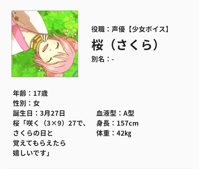 パルシア声優事務所に所属してる声優で優しく、真面目で礼儀正しい少女。普段は敬語で話すが心を開いてる相手や相手の要望によっては敬語抜きで話すことも。可愛い系やクール系な少女や女性、マスコットキャラなどを演じてるがまだまだ未熟だと日々練習を重ねる努力家。実は身体が弱い。