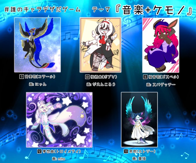 @mihopony さん主催の音楽+ケモノ誰デザに参加させて頂きました!! 自分が担当したのは11番の福音歌(ゴスペル)です! すぱげむちーのデザインした子は誰か当てて見てください!!リプ欄にアンケート貼ります!