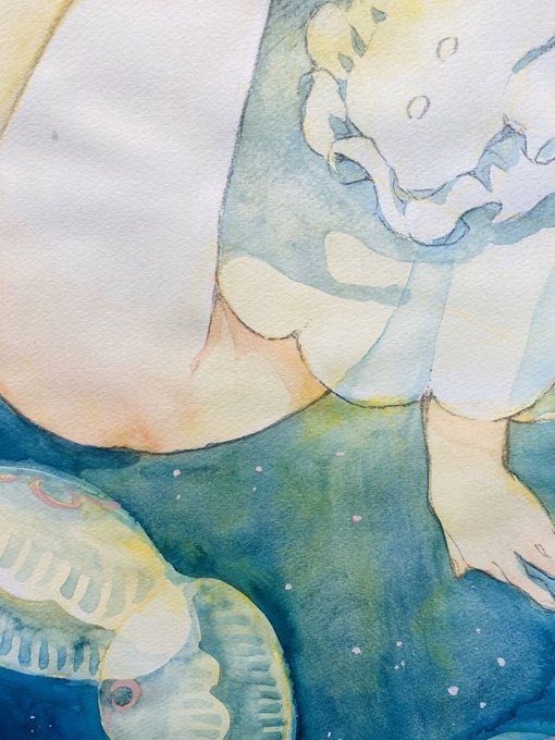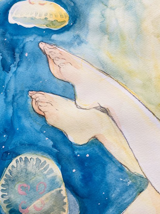 ご飯食べて缶ビールでドーピングして完成〜〜〜ミズクラゲちゃんでした。筆洗と絵の具皿と紙パレットがなくてプロントのコーヒー(L)がめちゃくちゃ役に立った(4枚目 #ライペ会