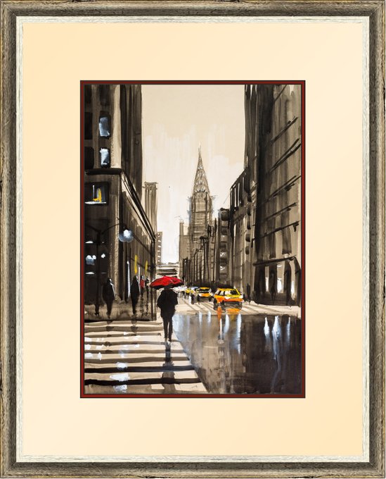 New York's Chrysler Building viewed from Lexington Avenue. Pops of yellow and red bring the scene to life.