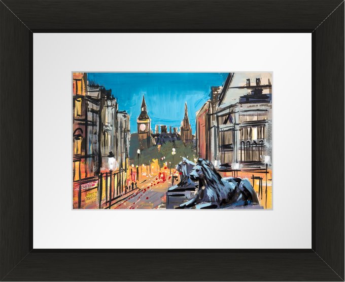 Warm light emanating from London's Trafalgar Square, painted with ink and gouache, and then finished with splatters of paint to suggest the rush of traffic and people.
