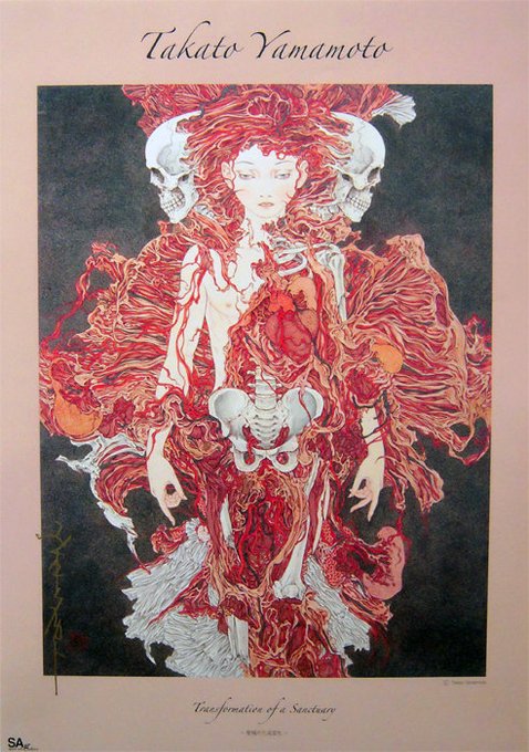 美しい男子といえば山本タカトでしょうどう考えても。まあ美少女もあるんだけど、とにかく美しい。グロっちゃグロだが刺繍のような繊細さなんよ。メメント・モリ。3枚めちんこ見切れとる。画集ほしいと思って10年以上経つとか怖っ…。はよ買えよ。