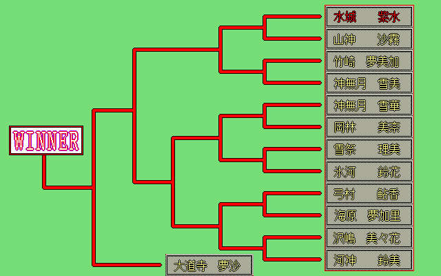 強制参加の最強美少女コンテストでの優勝が目的のSLG。バトエン感覚で対戦する。本戦で理事長を倒せばクリアだが、勝敗は完全に運である。せめて対戦相手の名前位は表示していて欲しい…。