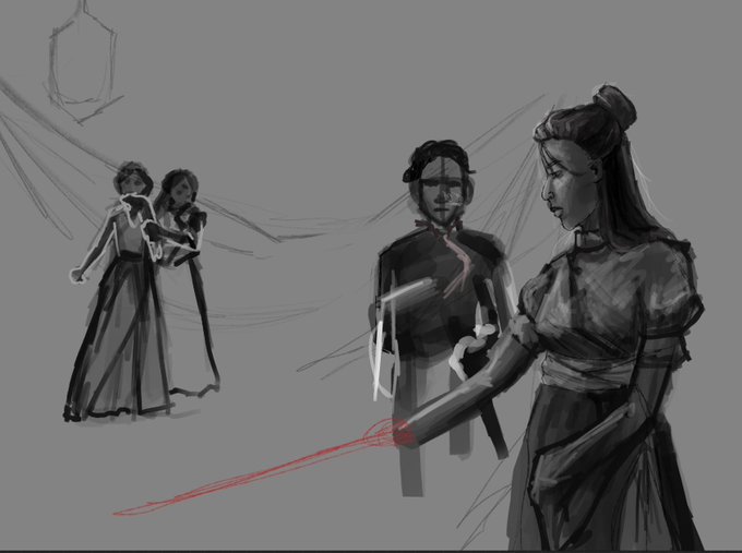 ok . first one. kickass scene from rhythm of war book. i’d have to rework posing tho. then, the last two show a potentional redraw.(the colored one is unfinished wip from 2017, following is it’s rework sketch). both options fanart of brandon sanderson books