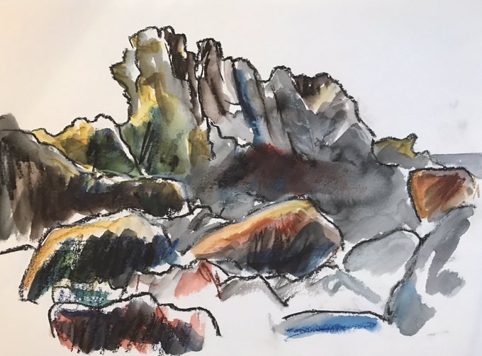 Sketches from Tregardock beach today. Astonishing rock formations and beautiful colours. Compressed charcoal and artgraf blocks.