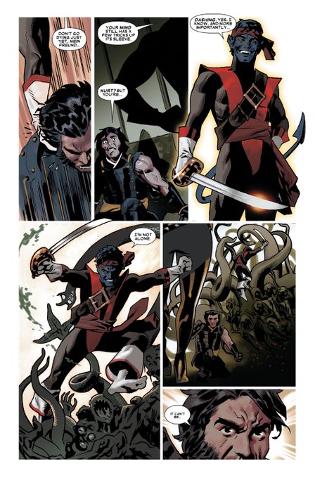 @3PanelContrast Wait, I lied: Maybe my favourite Kurt moment is when he showed up inside Logan's subconscious as a dashing pirate to save him from hell? From Wolverine #8.