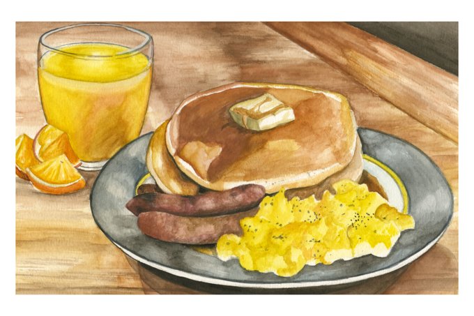 Breakfast (Pancakes, Sausages, Scrambled Eggs & Orange Juice) #art #painting #ArtistonTwitter #watercolor #illustration #foodart #artwork #watercolorpainting #traditionalart #breakfast #pancakes #eggs #sausages #orangejuice #foodillustration #comfortfood