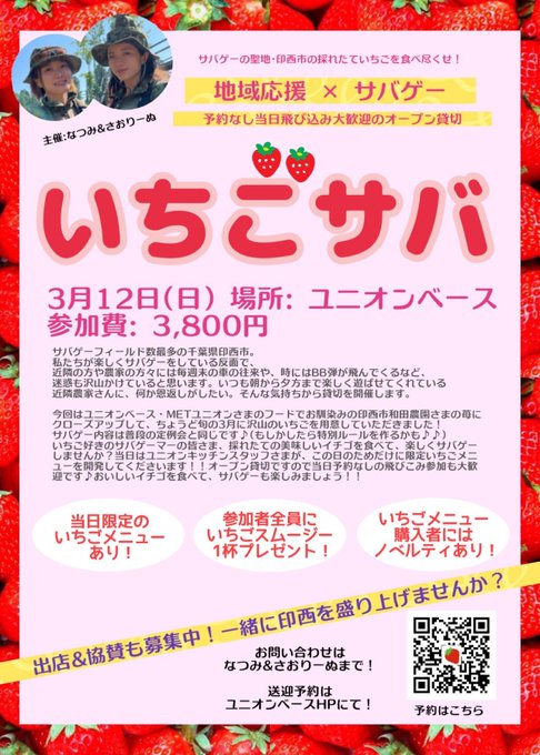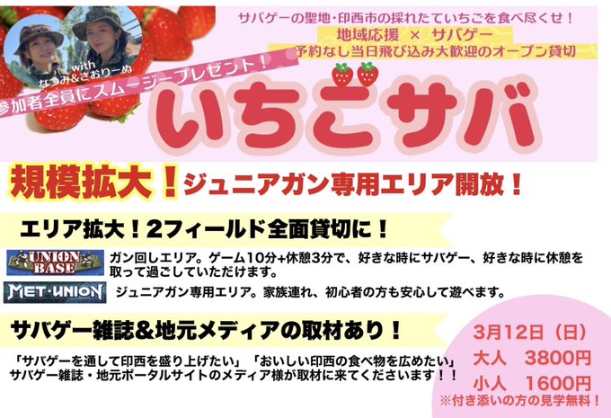親子で楽しめるサバゲーイベント #いちごサバ ‼️ 🍓3月12日(日) 🍓場所:ユニオンベース&METユニオン 🍓サバゲー🔫×印西の苺🍓のイベント 🍓限定いちごメニュー多数! 🍓見学無料! #千葉県 #印西市 #親子イベント #親子サバゲー #サバゲー ご予約、詳細はコチラ https://t.co/hquDObpbK3