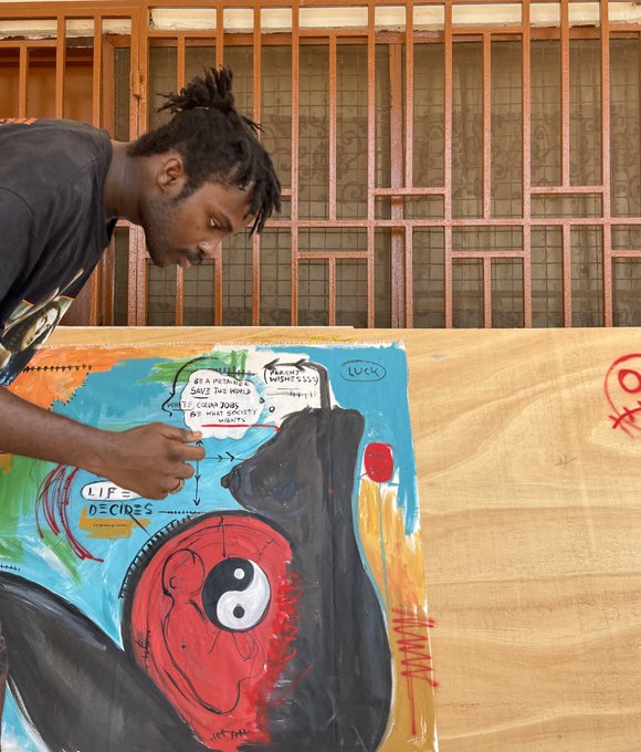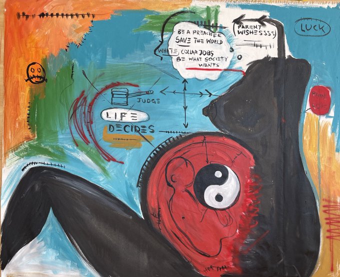 Oil pastels, acrylic paint and spray paint on canvas