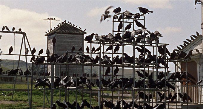À 20h55 sur @ARTEfr, #AlfredHitchcock excelle à créer une menace à partir de volatiles ordinaires dans «Les Oiseaux». Il y a des trucages, mais le suspense naît de la mise en scène. Comme le montrent l’attaque de l’école et le finale qui ont marqué à jamais le cinéma d’horreur
