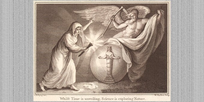 This intriguing image shows science personified as a woman, illuminating nature with her light. Museum ticket from late eighteenth century. Engraving by William Skelton (1763–1848), symbolizing knowledge of the natural world. Source: https://t.co/24UmOGxyZU