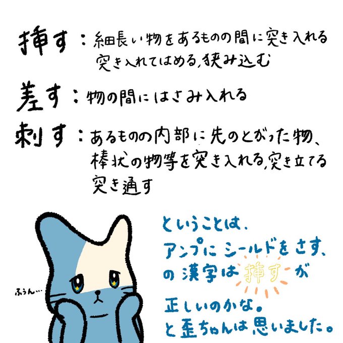 こないだのツイートで後から漢字が合ってるか不安になって調べたらやっぱり間違ってた😫 コンセントもシールドも、“挿す”ですね。 刺すだとちょっと怖いもんね🔪