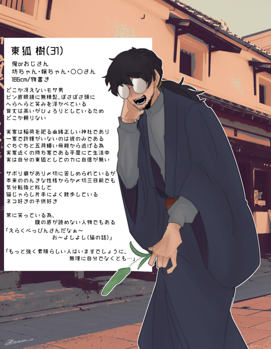東狐のおじさん?おにいさん? 頼りないけどいざとなったらワッ!とやってくれるはず お見合い断り続けてそろそろ勘当されそう #二十憑き家の許婚