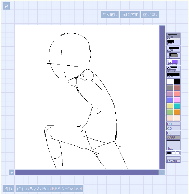 メイキング② 狭くて途中でキャンバスサイズ足してやんの…w すみっこに「た」とか書いてあるのはキャラの向きを間違えないためです。キャプチャだと右向きに戻してあるけど、左向きで描くの楽だかんね…