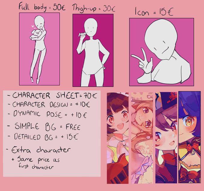 Full body illustrations like the first picture will be 80€ (negotiable) Everything else stays the same