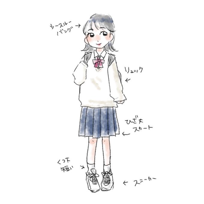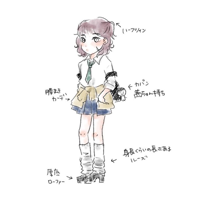 こないだ街で見かけたおんなのこの着こなしが平成ギャルみがあって可愛かったので、その子の着こなしをちょっと参考に子どもの頃憧れた平成ギャルのらくがきした あと最近の流行りはこんなのかしら?ってイメージ どっちも可愛いよね ちなみにわたしの頃は圧倒的紺ハイソでした