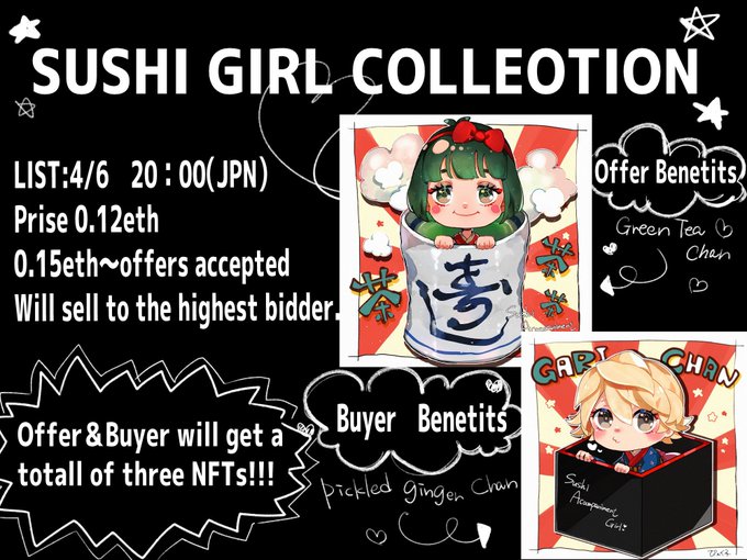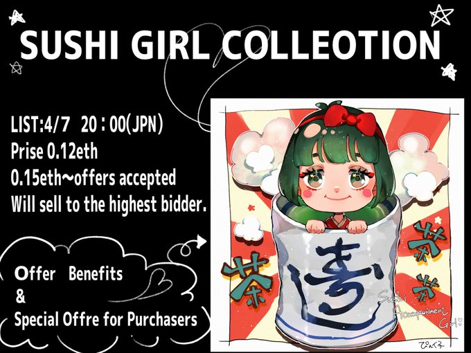 4/7 20:00より、0.12ETHにてお寿司ガールズちゃんをlistします✨