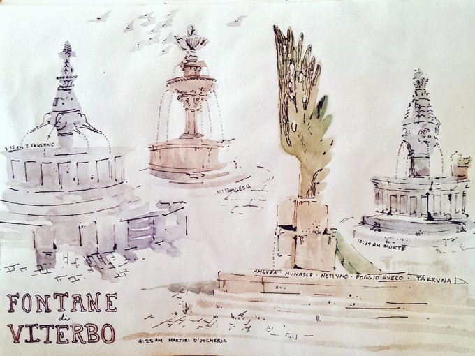 Today's sketches! Fountains and a view from my walk back to the residence.