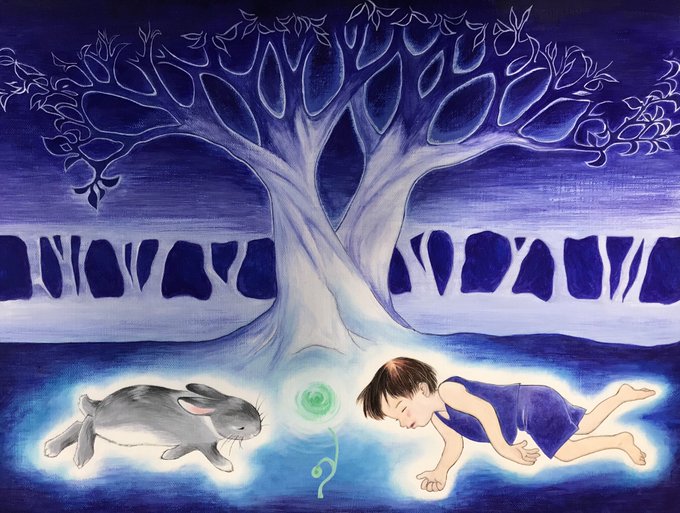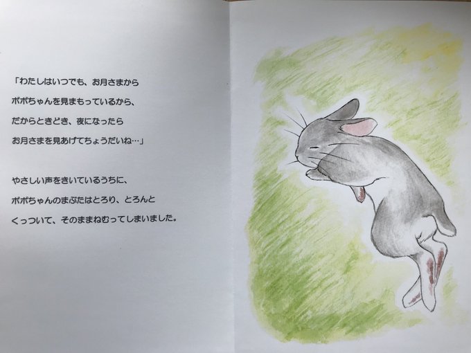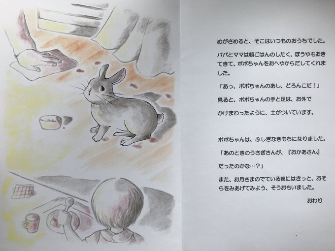 『ポポちゃんのおかあさん』⑤ あそんでいるうちに、まっくろなおそらがすこしあかるくなってきたとき、そのうさぎさんがいいました。「ポポちゃん、そろそろおうちにかえるおじかんよ」… おしまい!