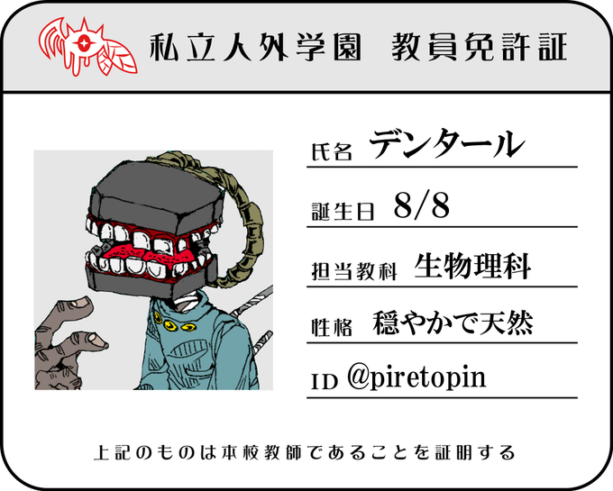 #私立人外学園 2人目失礼します。見た目気持ち悪いのに中身穏やかな異形頭先生のデンタールです。関係者様お友達、募集中です。交流もお気軽にどうぞ。
