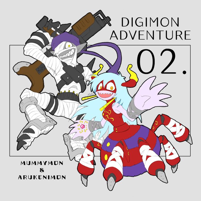 及川さんとアルケニモンで「My Curse」 もともとこの曲がメロディも歌詞もMVも大好きなのと、デジタルワールドに行きたい及川さんのイメージにぴったりでいつか描きたかったので……