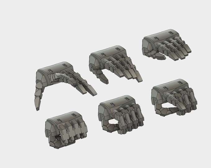 メガミ用のハンドパーツ6種どうにかモデル化まで辿り着いたー。 後は細かいところを調整してランナー付けて出力に投げるまで。来年はこの調整から取り掛かる感じかなぁ… #メガミデバイス
