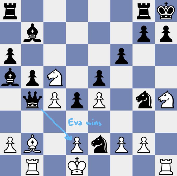 Eva’s king is trapped into the corner by her own pieces showing how she pushed herself into the corner. She believed she was too isolated and had no way to escape and she built a wall around herself in response. Like Damon said, she was self destructive