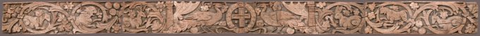 Pinewood with traces of polychromy. A lion and leopard sprint toward the center...Peacocks of paradise guard a gemmed cross between billowing curtains, draped and held behind two columns.