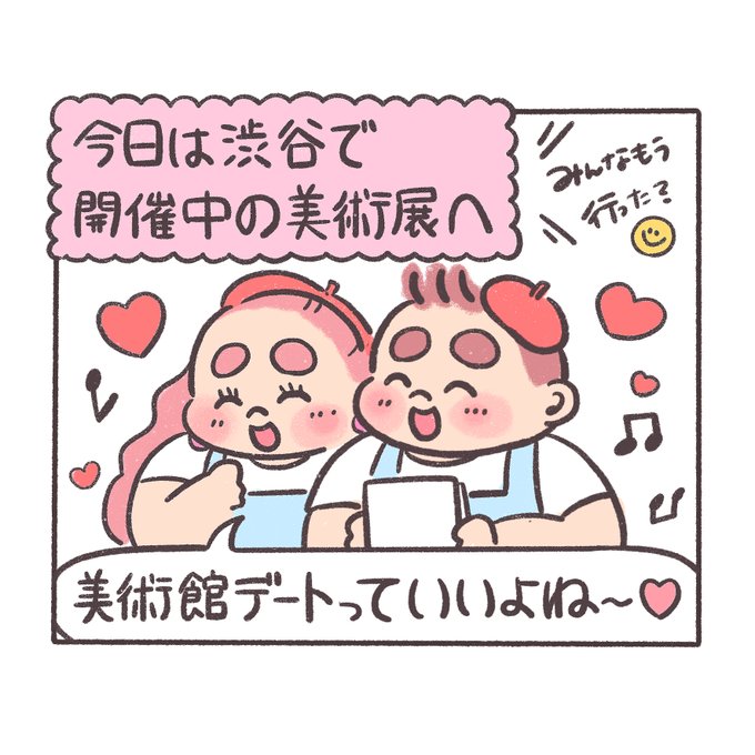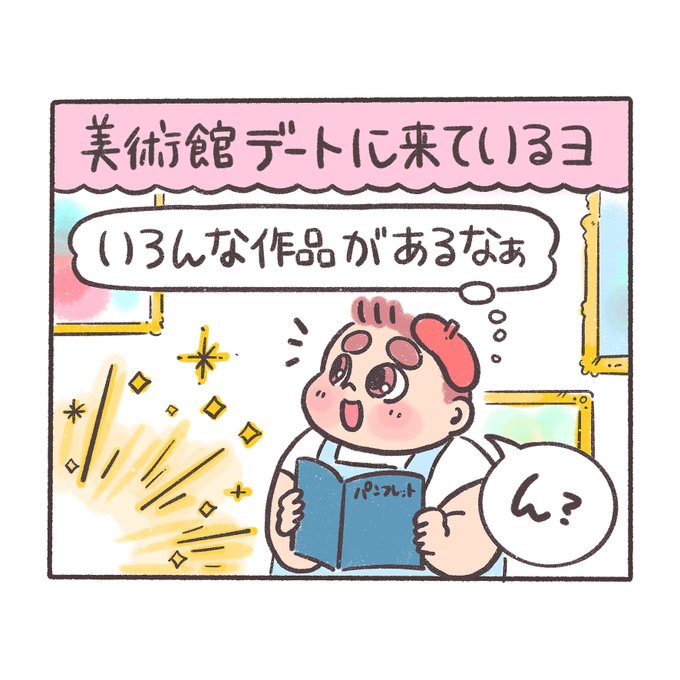 美術館デート ぽにょ🍟「お腹が空いてたらソワソワしちゃうもんねえ😊」 #ぽちゃ日和 #イラスト #illustration #漫画 #カップル漫画 #食べ物イラスト #腹ペコ #美術館 #美術館巡り #ボテロ展 #art #museum #リンクコーデ