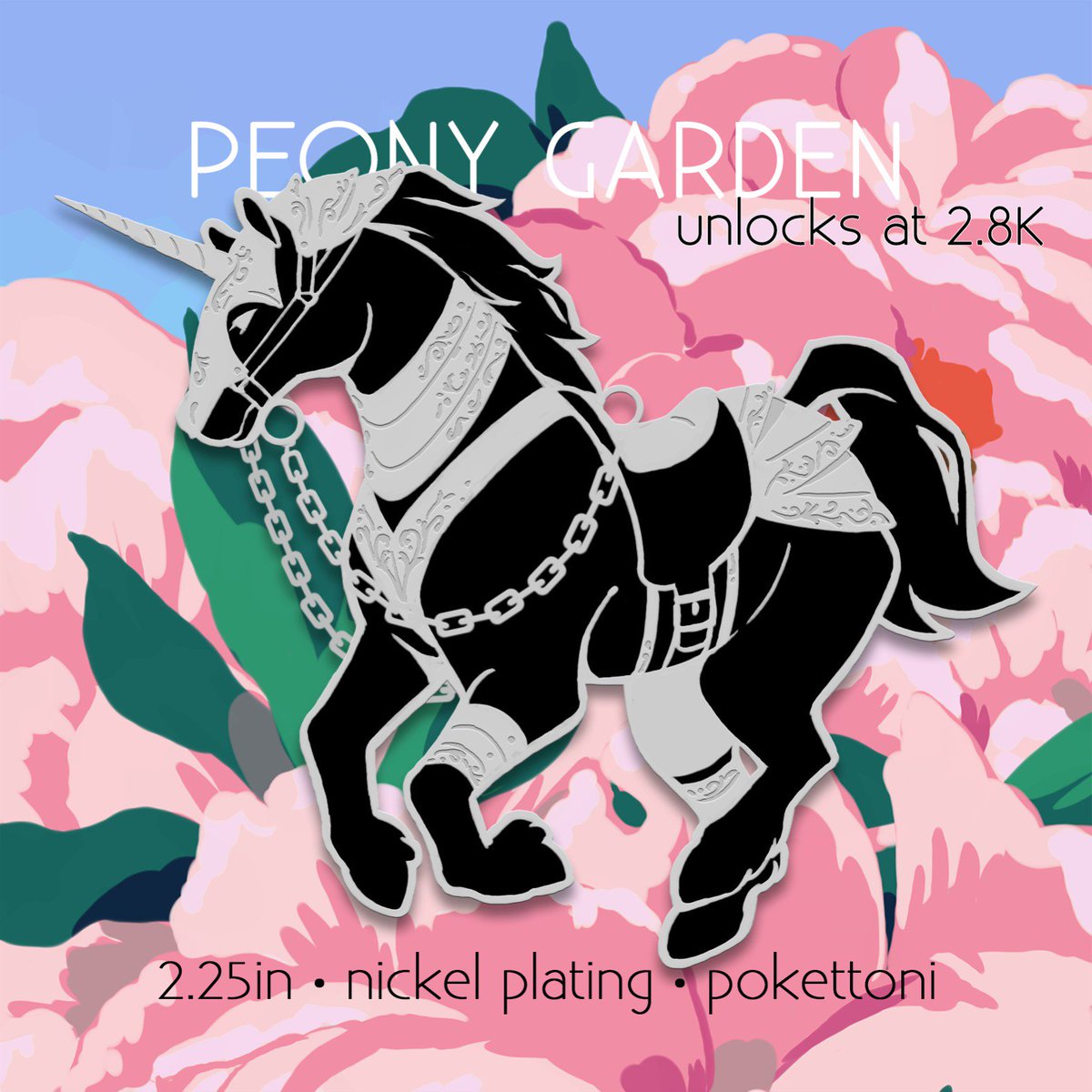 the first pin made for the peony pin banner ! this unicorn is decked out in filigree armor with chain reins ! you can get the banners AND the pins next month by pledging to our kickstarter. find the link below to get notifications for when it goes live 🖤