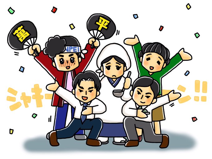 我ら!萬平さんを手伝い隊!!! 福ちゃん「邪魔はしないから…!」 岡&森本「いつでも呼んでください!」 鈴さん「私は福子を助けたいだけよ」 神部「辞めましょか!?今すぐ会社辞めましょか!!!???」 #まんぷく #ぷく絵 #まんぷく絵