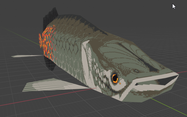 Back onto the head, it's now got a pattern on the top and a mouth. The mouth is like the pocket on a pair of trousers - it's isolated from the outside wall to prevent z-fighting. I also highlighted the eye as I was working and thought it might look good in orange (it does).