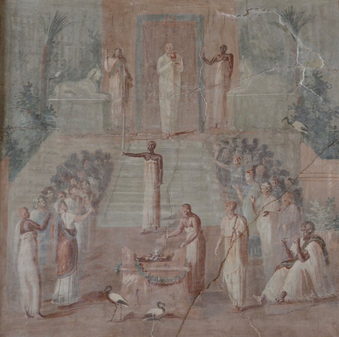 For those interested the last image is a detail from one of two stunning frescoes from #Herculaneum showing stages of a religious ritual dedicated to Isis. The god is symbolised by water in a golden vase. from The other fresco also has some lovely ibises lurking around the altar.