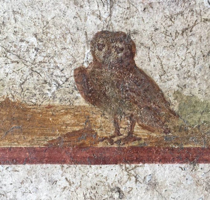 Plenty of superb owls in #Pompeii but perhaps my favourite is the graffito in the House of the Cyptoporticus that looks like an owl-headed person hunting an oversized chicken.