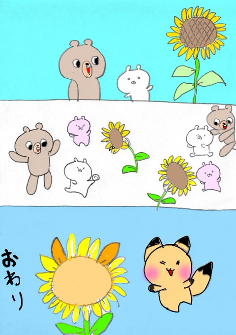 そしてラストです! ゴンちゃんが居なくなった 次の日に そこに無かったはずの 「ひまわり」🌻が咲いてました ひまわりはずっと太陽だけを見てますね そして そのひまわりは ずっとうさまる達だけを見てます そのひまわりゴンちゃんに似てませんか? 最後まで見てくれてありがとうございました