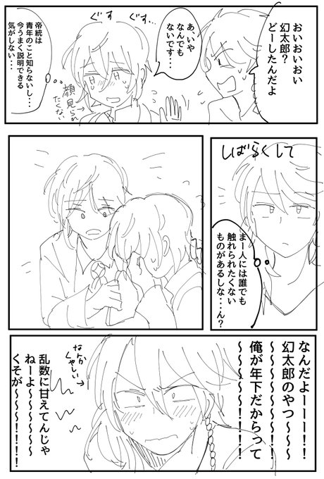 青年関係のことで人に泣きつきたくなくて、帝統は拒否すれば踏み込んでこないんだけど、既に乱数ちゃんは知ってるし話聞きだすの上手いし泣いてるの見られたらしつこいしで話すしかなくなって、話してるうち不安も落ち着いてきてだんだん甘えちゃう夢野先生とそれ見て「むか~~~」ってなる帝統くん