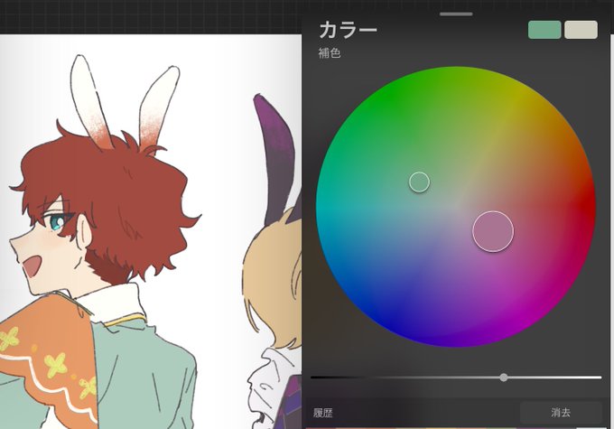 父母で予習してたはずなのに、こないだの絵を描いてて初めてあなたたち、補色なのね…………!って気づいた🫶🐰 (ミントグリーンと紫の話)