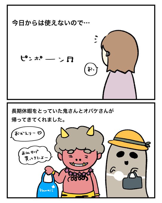 おかえり、👹さん👻さん。 #育児漫画 #漫画が読めるハッシュタグ #ぽぽの四コマ漫画